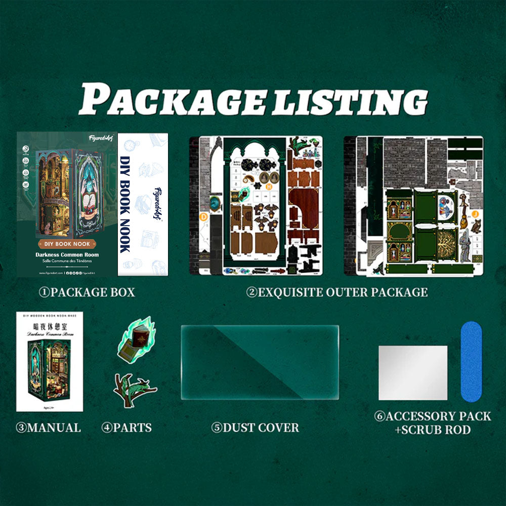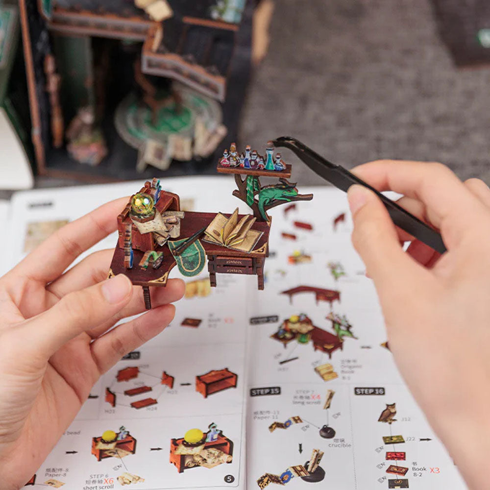 Ce book nook DIY mesure environ 170 × 95 × 115 mm une fois terminé et se compose de 156 pièces. Le kit comprend des pièces en bois prédécoupées, des accessoires miniatures en papier, un système LED avec fils et boîte à piles, une couverture anti-poussière, ainsi qu’un manuel illustré étape par étape et une photo de référence. Tout est prêt, il ne reste qu’à vous lancer.