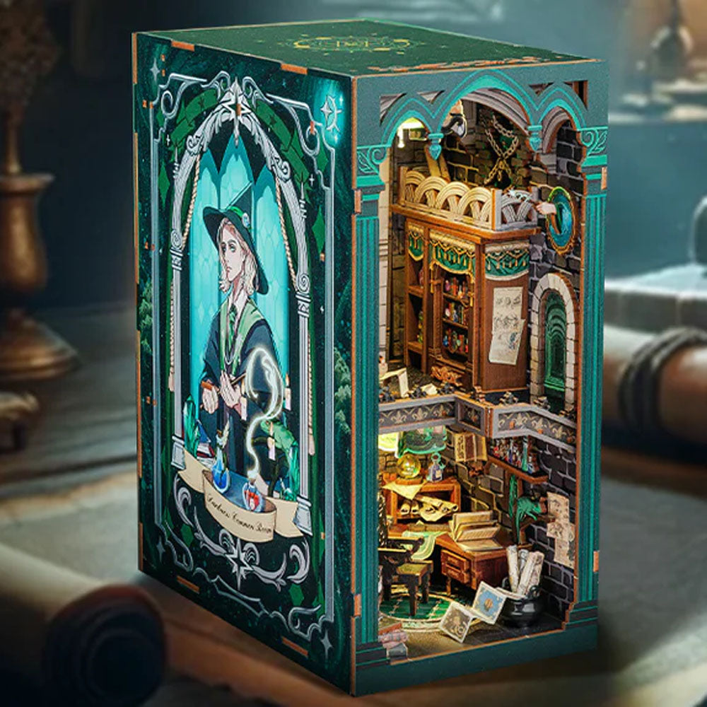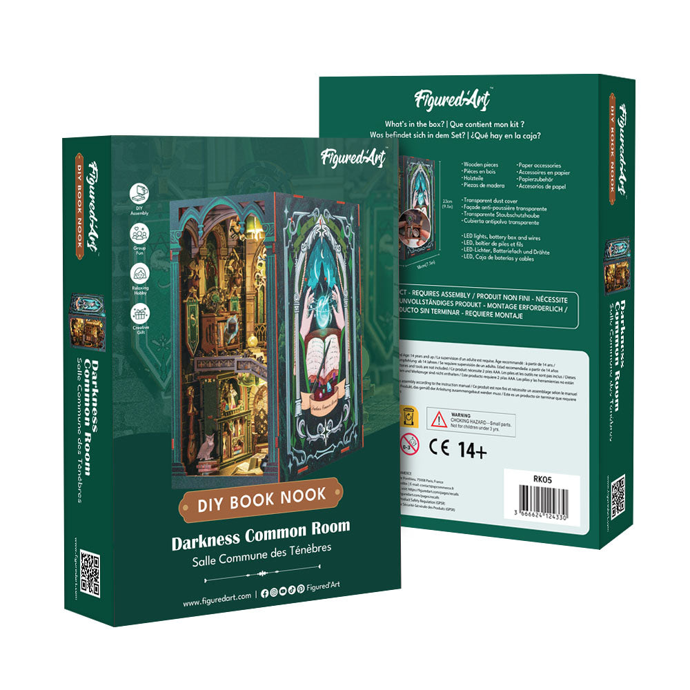 Ouvrez la boîte, et la bibliothèque s’efface. Devant vous, la Salle Commune des Ténèbres prend forme : murs de pierre, table magique éclairée, potions mystérieuses et lumière douce qui guide le regard. Ce book nook transforme un simple rayon de livres en scène vivante, presque chuchotante.