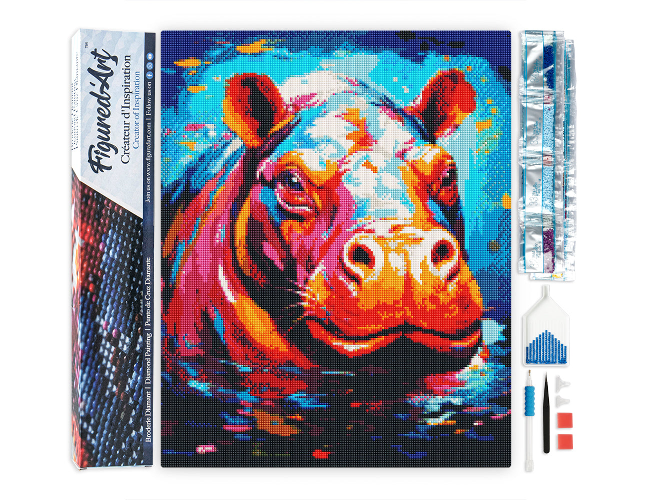 Imaginez votre table transformée en espace créatif. Devant vous, un hippopotame abstrait, généreux et expressif, attend que chaque diamant trouve sa place. La Broderie Diamant devient un moment à soi, calme et concentré, où les couleurs se répondent et dessinent peu à peu le motif.