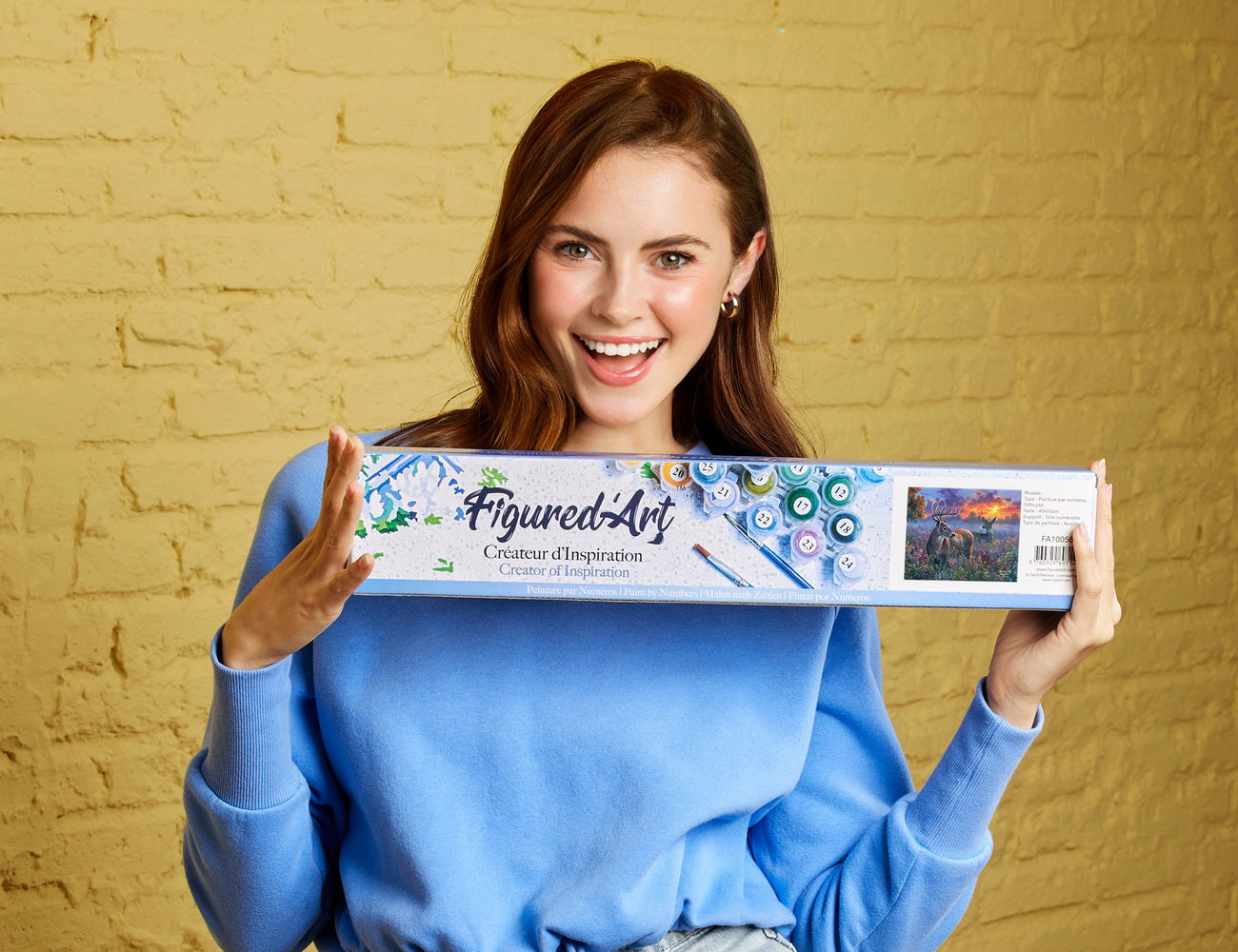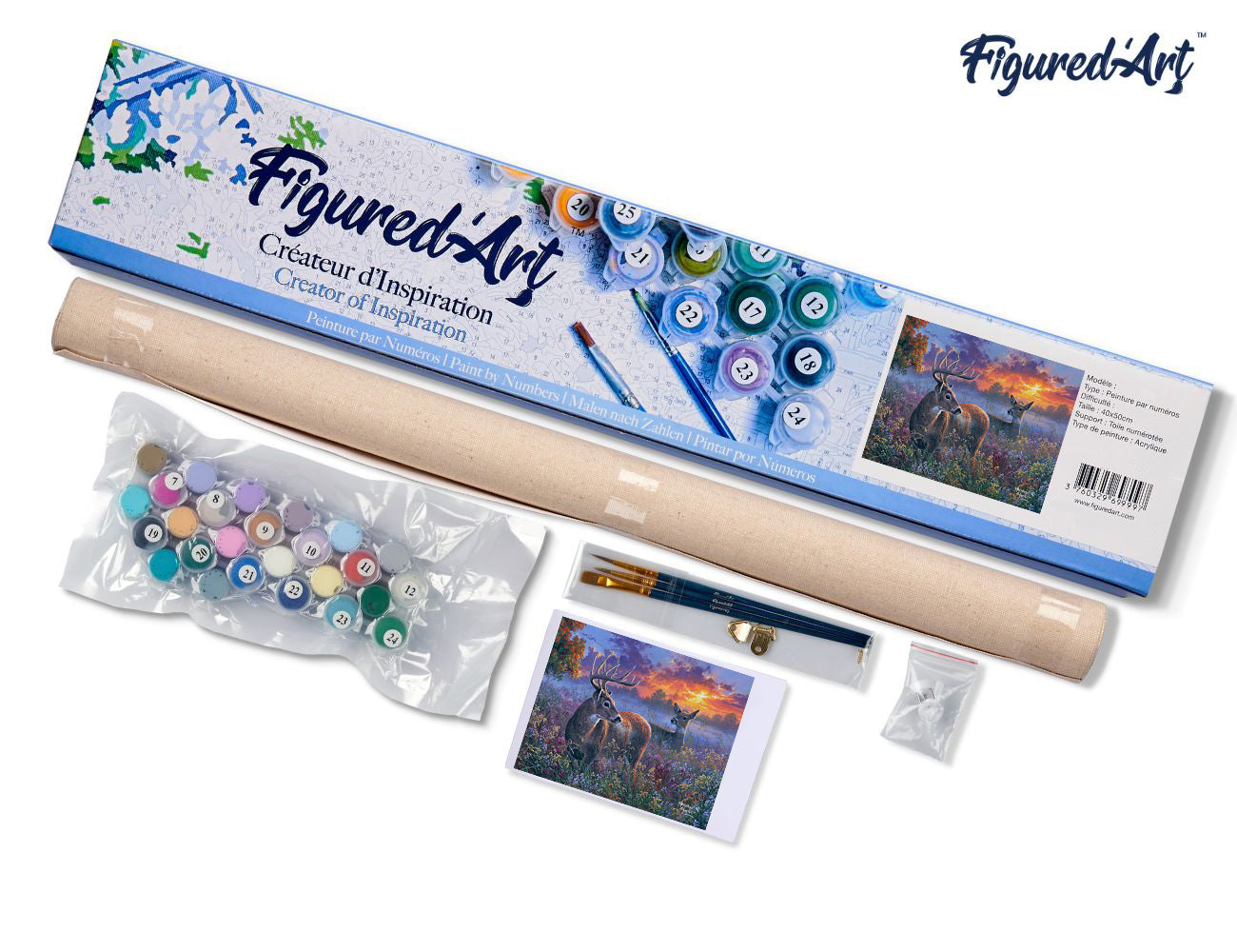 Cette peinture par numéros est proposée sur une toile en lin numérotée de 40 × 50 cm, livrée roulée. Le kit contient tout le nécessaire pour réaliser l’œuvre : peintures acryliques numérotées, trois pinceaux en nylon de tailles différentes, une photo miniature de référence, ainsi que deux vis et deux crochets pour l’accrochage.