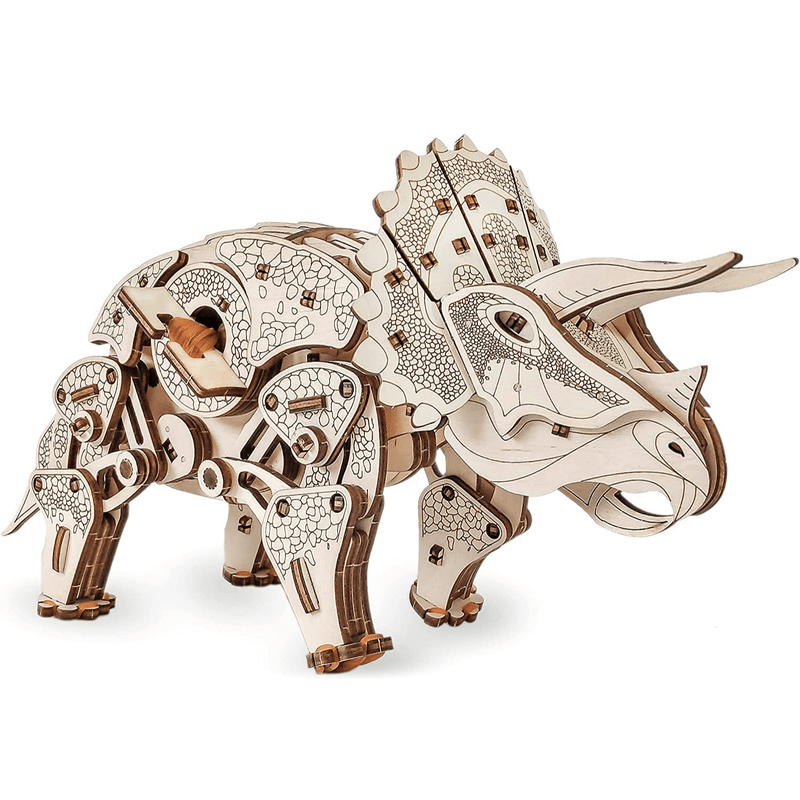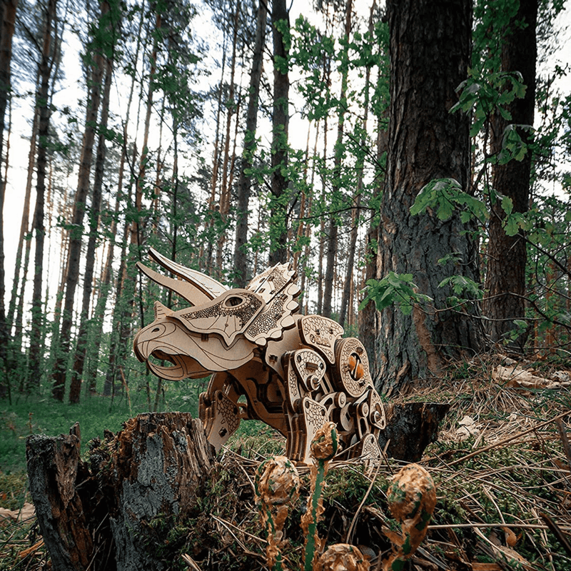 Imaginez la scène : la table est dégagée, les pièces en bois attendent. Vous assemblez, le squelette prend forme, puis vient le moment magique. Un tour de remontoir, et votre Triceratops avance sur ses quatre pattes, la tête et la queue en mouvement.