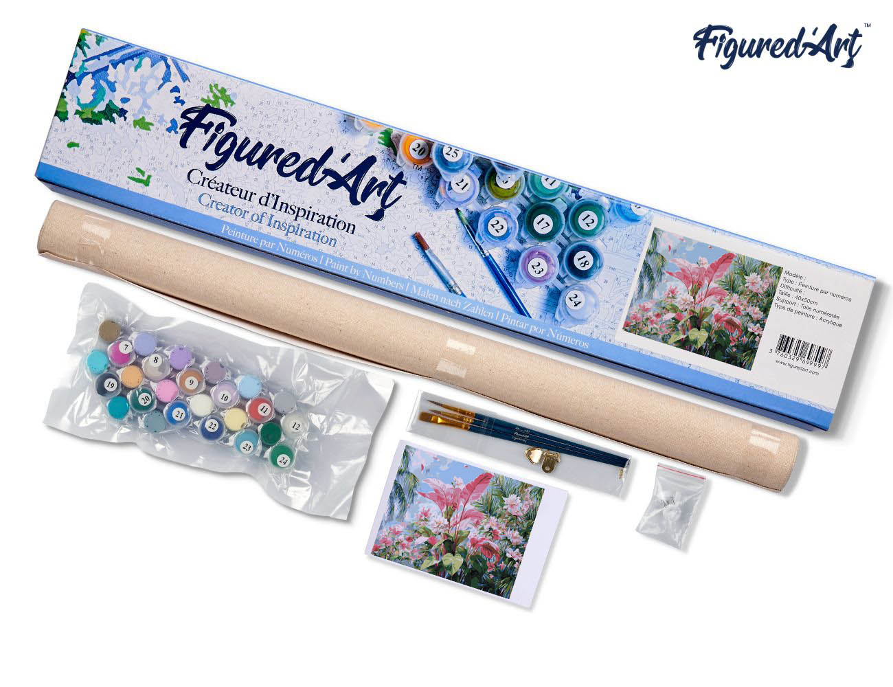 Cette peinture par numéros est proposée sur une toile en lin numérotée de 40 × 50 cm, livrée roulée. Le kit comprend la toile, des pots de peinture acrylique numérotés, trois pinceaux en nylon de tailles différentes, une photo miniature de référence ainsi que les éléments nécessaires à la fixation murale.