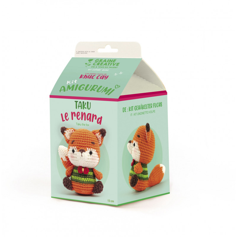 Ce kit crochet amigurumi comprend le matériel nécessaire pour réaliser Taku le renard : des mini pelotes de fil à crocheter, de la ouate de rembourrage, un crochet, des aiguilles, un marqueur de maille, un nez en plastique ainsi que des instructions détaillées pas à pas. Tout est prévu pour crocheter sans avoir à chercher d’accessoires supplémentaires.