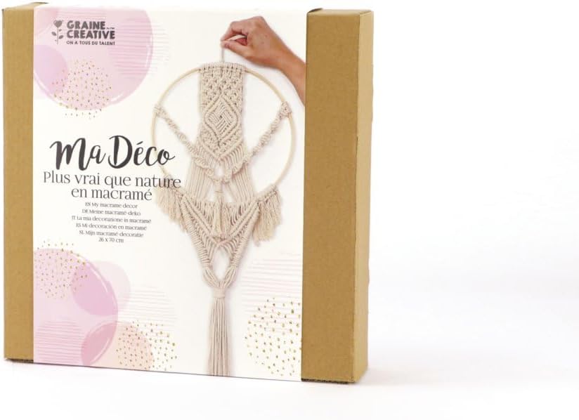 Ce kit macramé comprend 65 mètres de fil de coton câblé, un cercle en bambou ainsi qu’un mode d’emploi illustré pour suivre les étapes en toute tranquillité. Le nécessaire est inclus pour réaliser votre suspension sans avoir à chercher ailleurs.