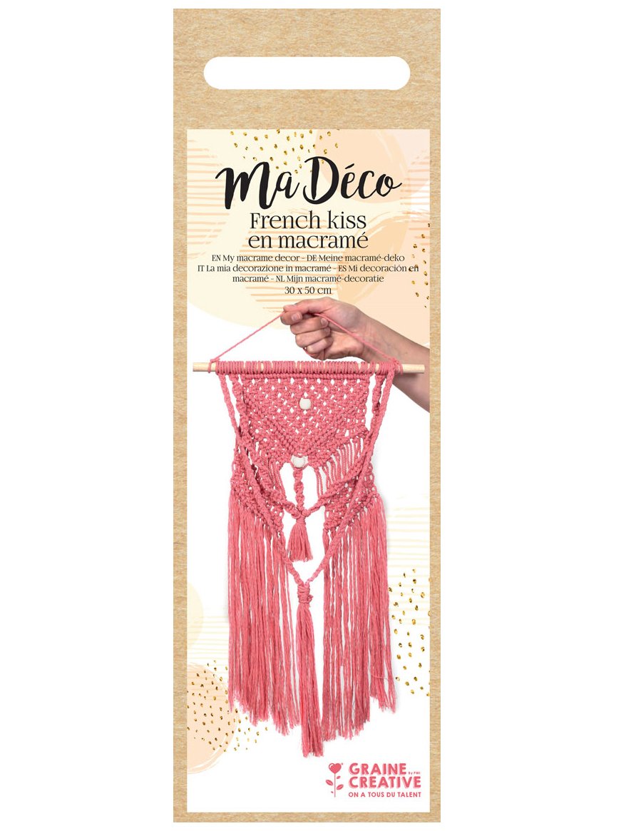Vous ouvrez le kit, vous sentez le coton entre vos doigts, et très vite les premiers nœuds dessinent la tenture. Le modèle French Kiss apporte une touche douce et graphique, parfaite pour habiller un mur sans en faire trop.