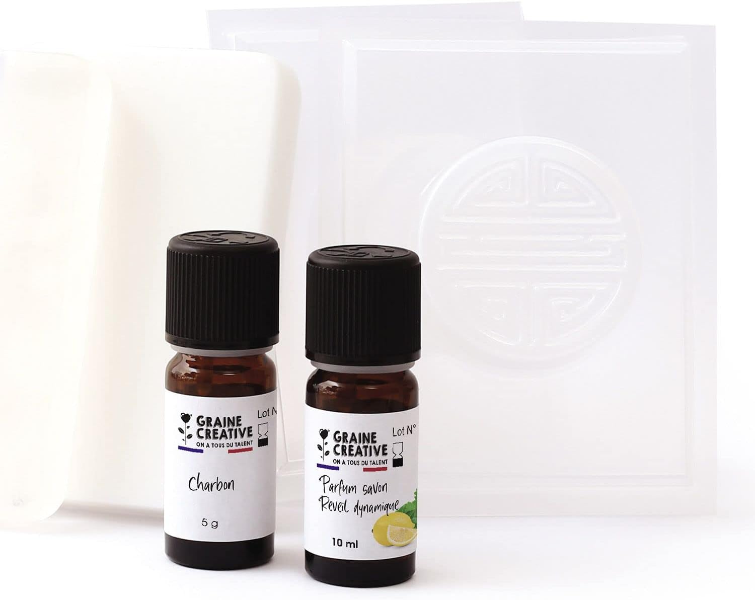 Le kit comprend 200 g de savon au total : 100 g de savon blanc opaque et 100 g de savon transparent, 2 moules (lotus et symbole chinois), 1 flacon de poudre de charbon (5 g), 1 parfum réveil tonique (10 ml) et 1 mode d’emploi illustré. Le nécessaire est réuni pour fabriquer plusieurs savons au charbon.