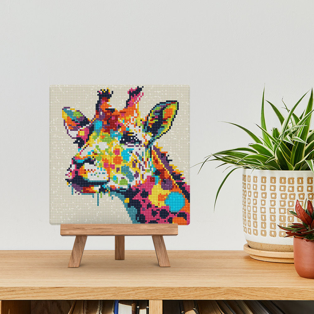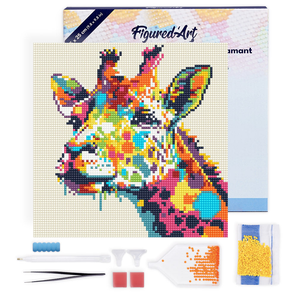 Vous ouvrez le coffret, la toile est déjà tendue sur son châssis en bois. Devant vous, cette girafe abstraite Pop Art n’attend plus que vos gestes pour prendre vie. Les couleurs vibrent, les formes se répondent, et chaque diamant posé transforme peu à peu l’image.