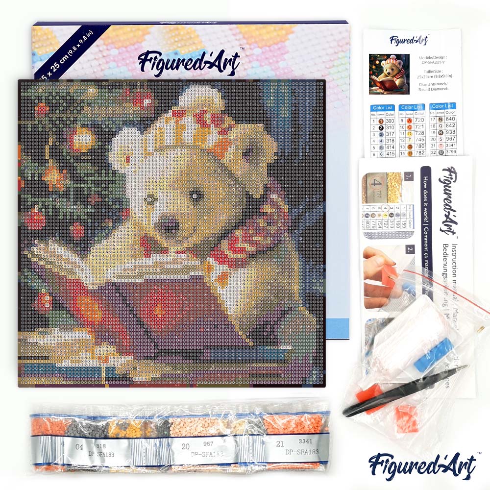 Vous ouvrez la boîte, la toile est prête, les diamants brillent doucement. Petit à petit, cet ours mignon plongé dans son livre prend vie sous vos doigts. La Broderie Diamant devient un vrai moment de calme, parfait pour se poser après une journée bien remplie.