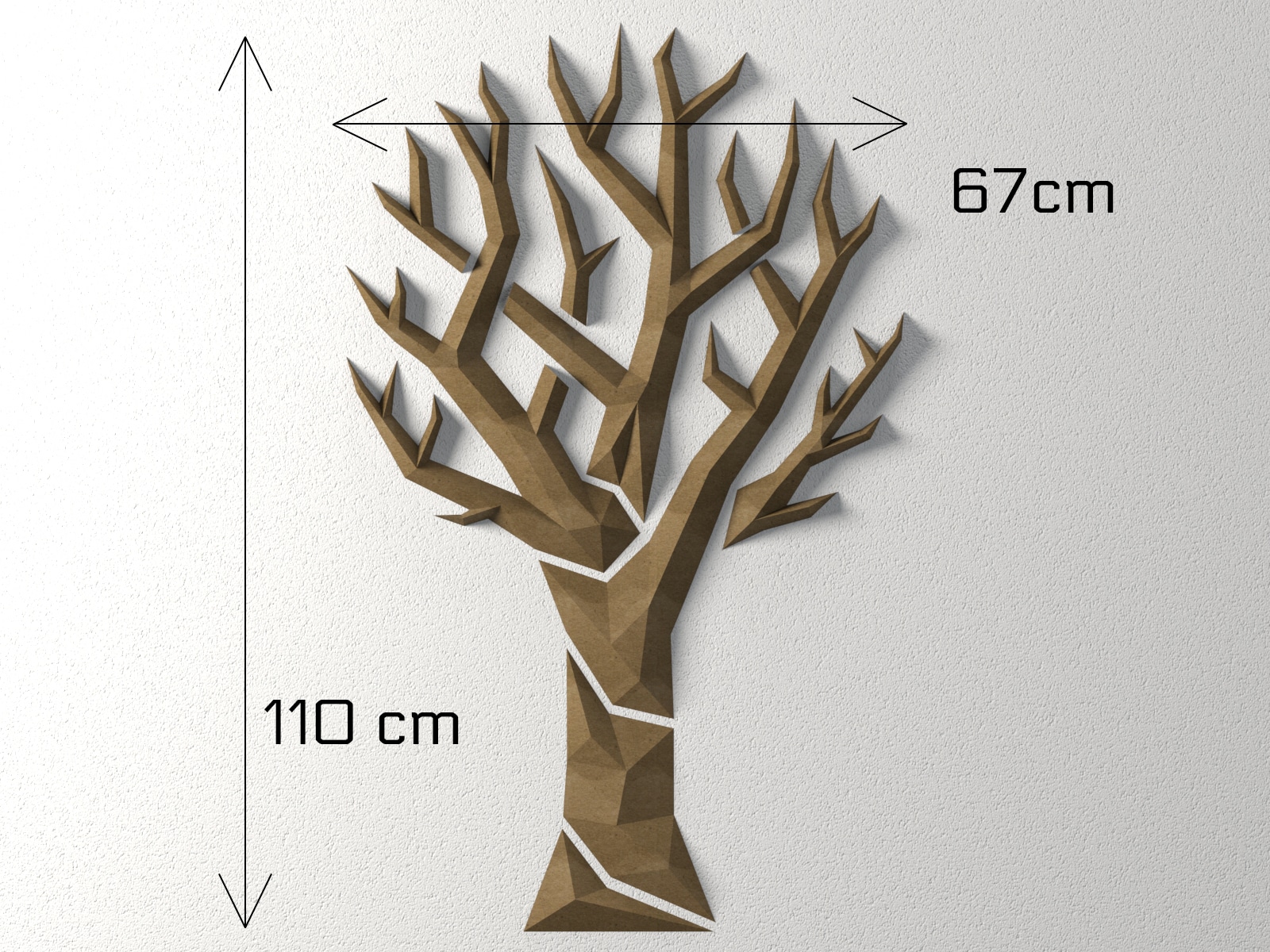 Assemblé, l’arbre mural mesure 1100 mm de hauteur, 670 mm de largeur et 310 mm de profondeur. Sa présence est marquée sans alourdir l’espace, idéale au-dessus d’un canapé ou sur un mur d’accent.