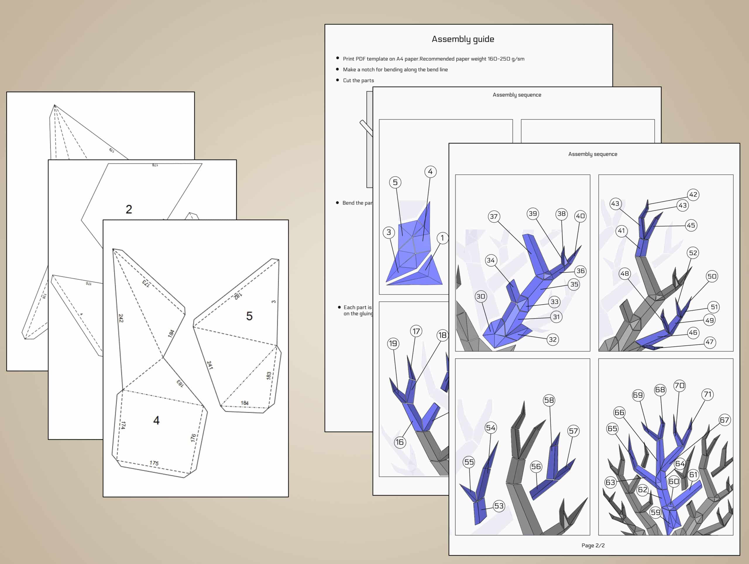 Le kit comprend 30 feuilles imprimées sur un papier français de qualité, issu de sources responsables, stable dans le temps et agréable à travailler. Tout est inclus : il ne vous reste qu’à découper, plier et coller.