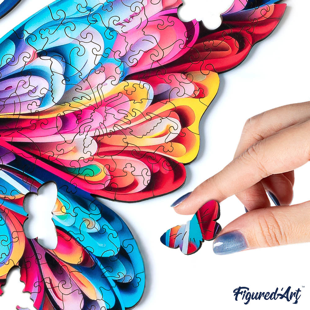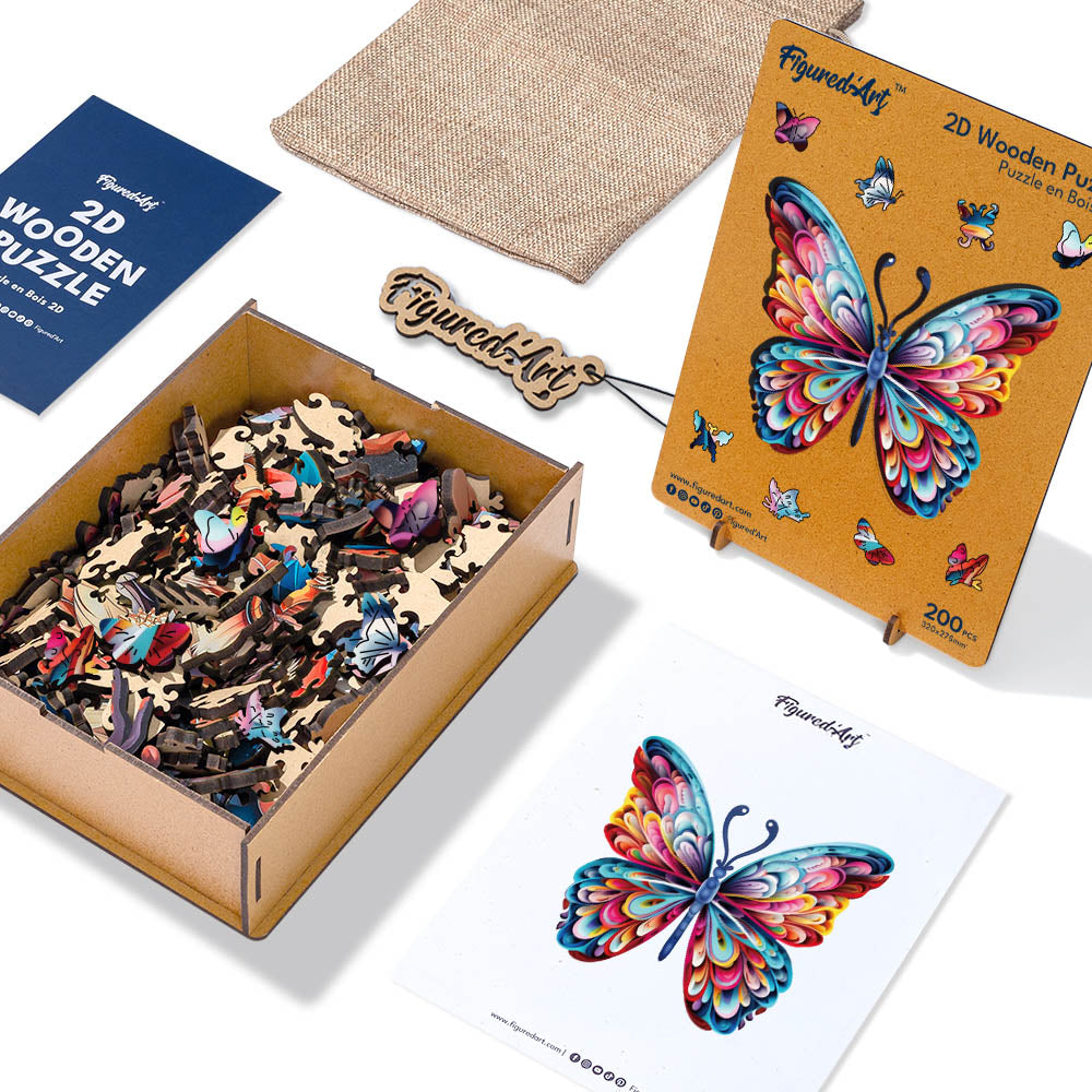 Vous ouvrez le coffret, les pièces en bois glissent sous vos doigts. Les couleurs apparaissent peu à peu, les formes surprennent, et le Puzzle prend vie. Ce papillon arc-en-ciel se construit dans le calme, au rythme de vos envies, pour un vrai moment créatif à la maison.